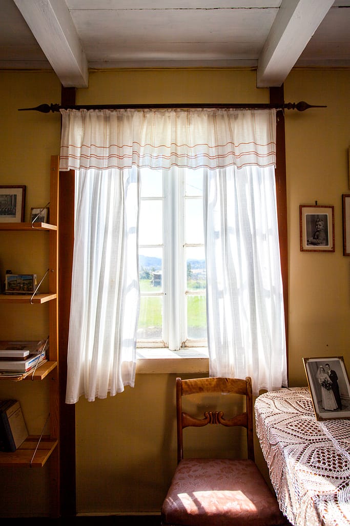 Denne type gardiner, med retthengende sidesjal og en smal, rynket kappe, er i tråd med svenske Ellen Kays ånd, ble populære fra 1930-årene og framover til 1970-tallet. Foto: Kari-Marte Frøyset
