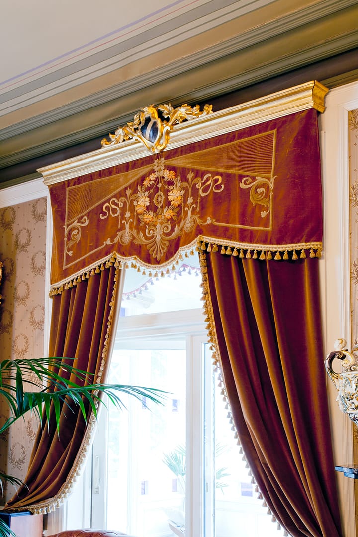 En slik glatt og foret kappe, skåret i buer og tunger, kalles lambrequin. Kappene kom på 1600-tallet og fikk en renessanse under historismen, ca 1850-1900. Lamberquinene ble gjerne kombinert med tynne, hvite sidegardiner. Foto: KM Frøyset