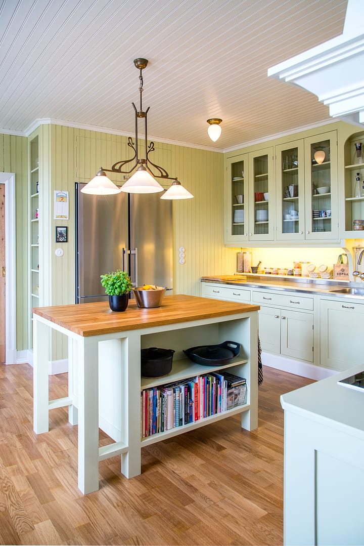 • Kjøkkenøya er både funksjonell og sammen med jugendlampene fra Molo, bidrar denne til å skape den gode stemningen i rommet. Benken foran vinduet bidrar selvsagt også til dette