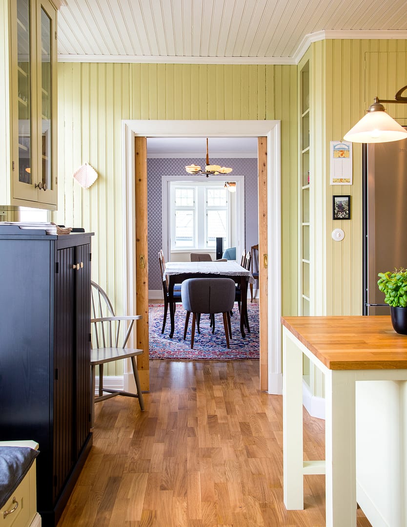 Skyvedøra mellom kjøkken og spisestue er satt inn av den forrige eieren. Her var det opprinnelig et spiskammer, men det var fjernet. Over skyvedøra ser man litt av det opprinnelige perlestaffpanelet til venstre ved bokhylla. Det nye panelet er til høyre mot vinduet.