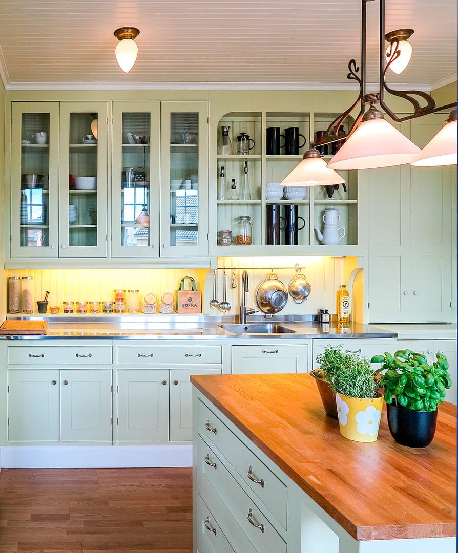 Kjøkkeninnredningen er malt med Jotuns 8087 «Vårluft» NCS-kode S 1715-G87Y.