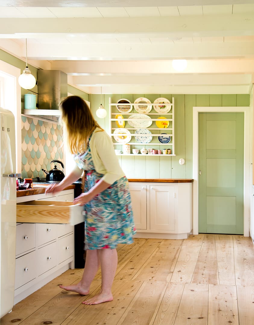 Tømmerveggene i det koselige kjøkkenet er malt i lysegrønt, gulvene er ubehandlede mens innredning og tak er malt i hvitt. Som i resten av huset har paret valgt linoljemaling. Den store aubergine-fargede AGA-komfyren er kjøkkenets blikkfang. Rolls Roys-versjonen har fire ovner med ulike temperaturer. Den har ingen «fancy» innstillinger eller knapper. Det er en helt annen måte å lage mat på enn i vanlige elektriske komfyrer! Maria elsker den.