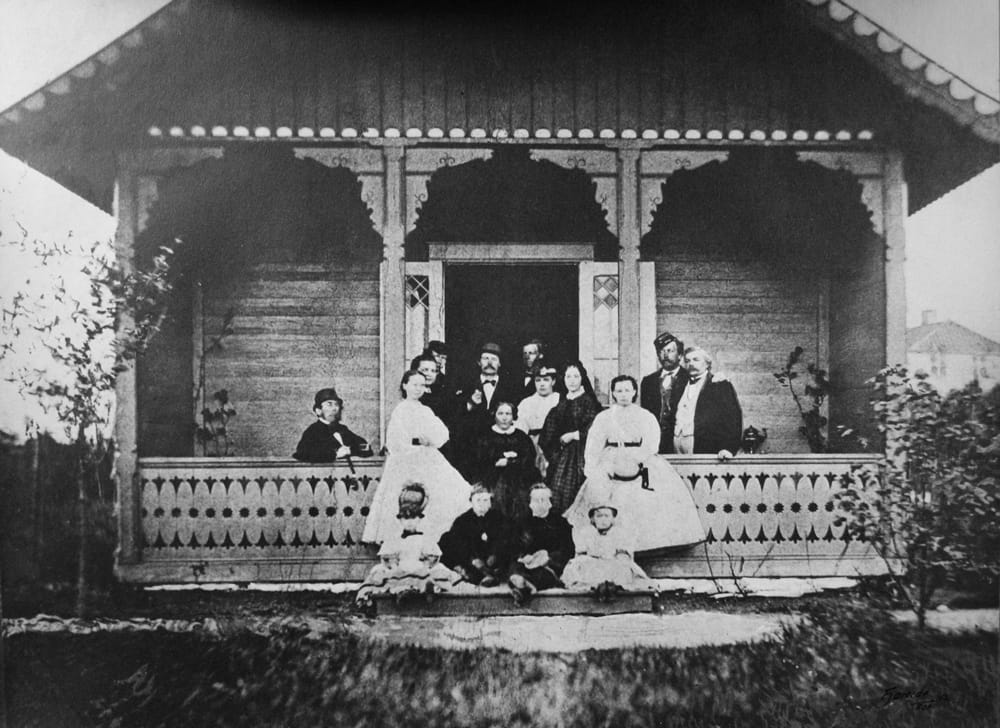 Johan Mandius Köhler med familie, fotografert utenfor paviljongen i 1865, tre år før han gikk konkurs.