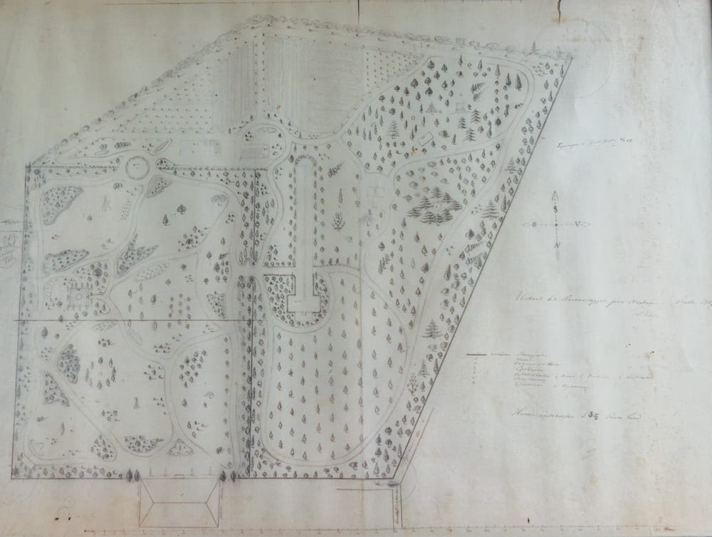 På veggen henger en hageplantegning av hagen hvor lysthuset opprinnelig sto, slik den var tenkt. Planen ble aldri gjennomført.