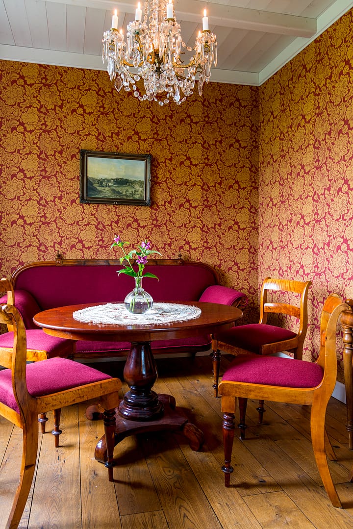 Salongen har tapet fra Lim & Handtryck, biedermeiermøbler trukket med rødt stoff og prismekrone, slik Bolette beskrev.