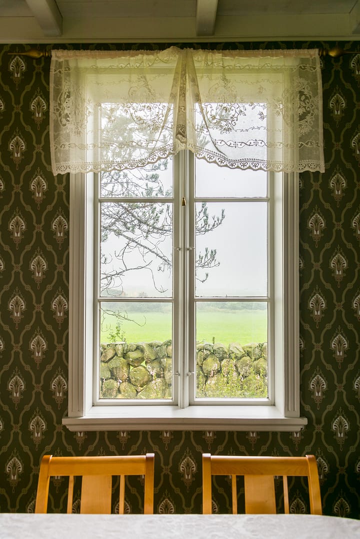 Vinduene er satt i stand med håndlaget glass. Legg merke til de flotte, gamle steingjerdene utenfor.
