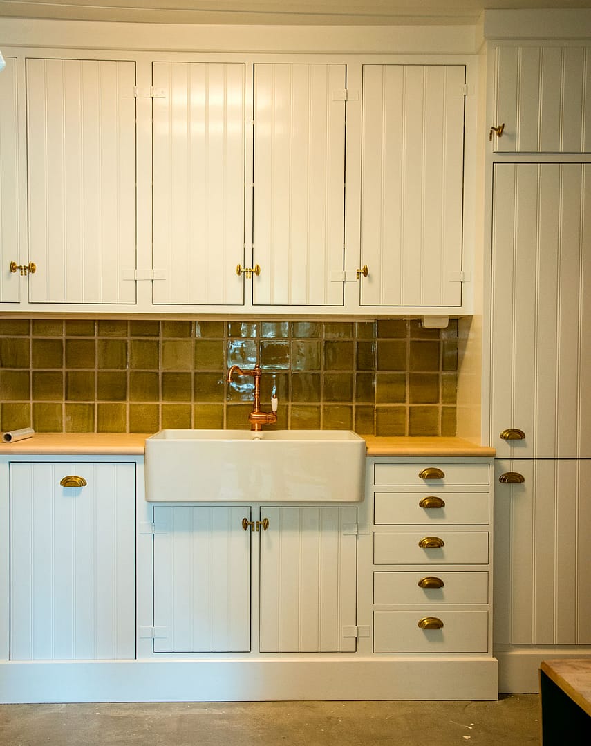 I grovkjøkkenet har snekkeren laget nedfellbare bakste-bord. Gulvet er lagt med norsk skifer.