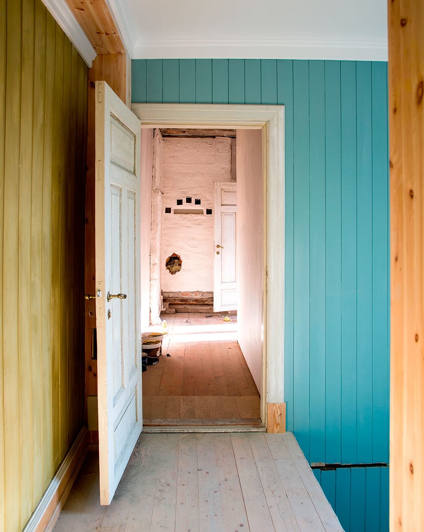 Gangen i andre etasje er under arbeid. Den vakre blåfargen er spesialblandet linoljemaling og har fått navnet «Kaserneblå»