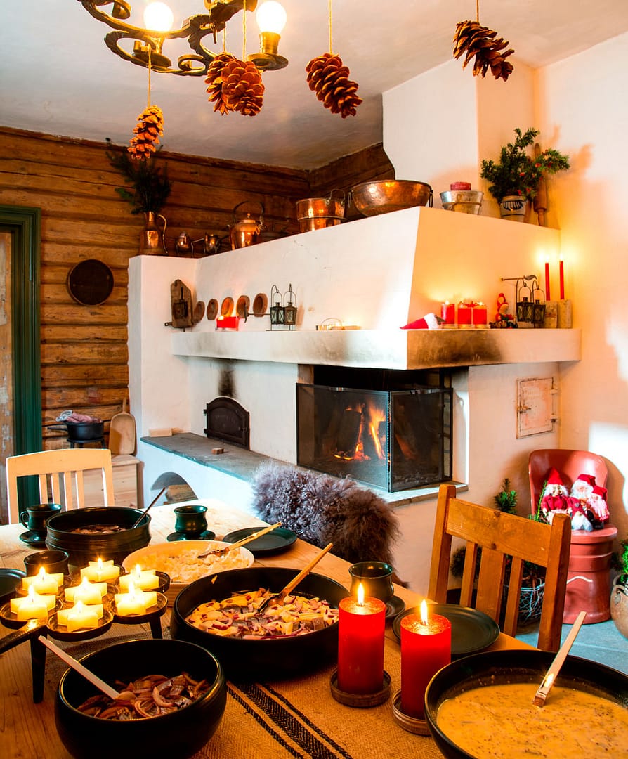 Inger Kristin og Øivind inviterer gjerne venner til sildelag før jul. Da fyres det i peisen og serveres rykende ferskt bakerovnsbrød. Man får lett julestemning i dette koselige rommet!