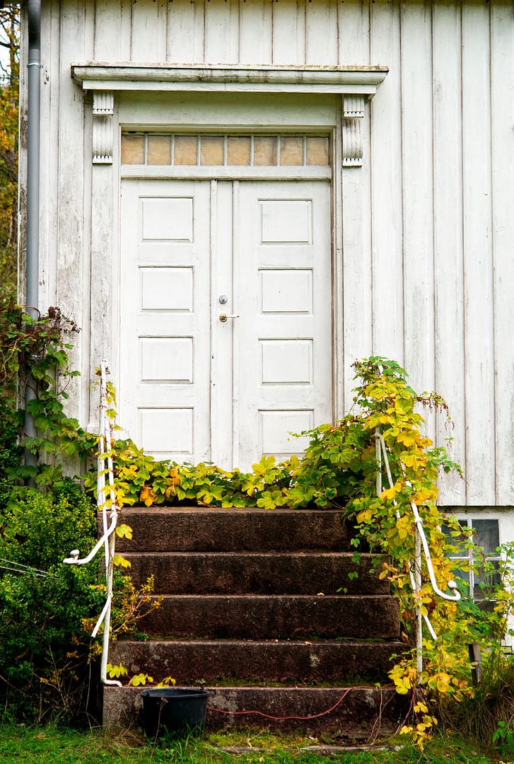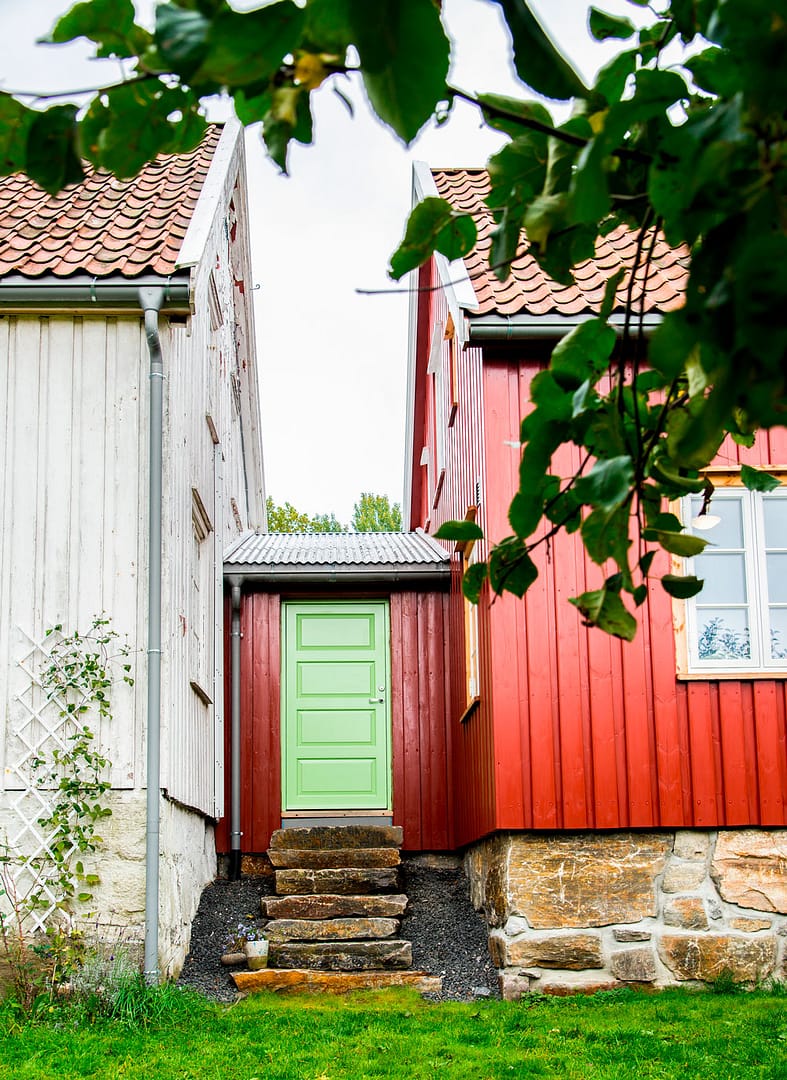 Mellomgangen har fått tak av blikkplater, slik man kanskje ville gjort i gamledager. Blikkenslagerarbeidene er utført av Inge Myhren. Trappa og grunnmur i granitt er fra et lokalt brudd, levert av Froland utbyggingsselskap. Profilert panel, i en litt grovere dimensjon enn hovedhuset kommer fra en lokal bygdesag. Dørene er laget ved Solfjeld AS i Tvedestrand og levert ferdig malte. Denne lysegrønne fargen har familien funnet igjen flere steder i huset. Tilbygget er malt med linolje i fargen «Järnoxidröd 130». – Den er litt dyrere, men utrolig drøy. Vi brukte bare litt over 6 liter totalt på tre strøk på tilbygget, forteller Kristin.