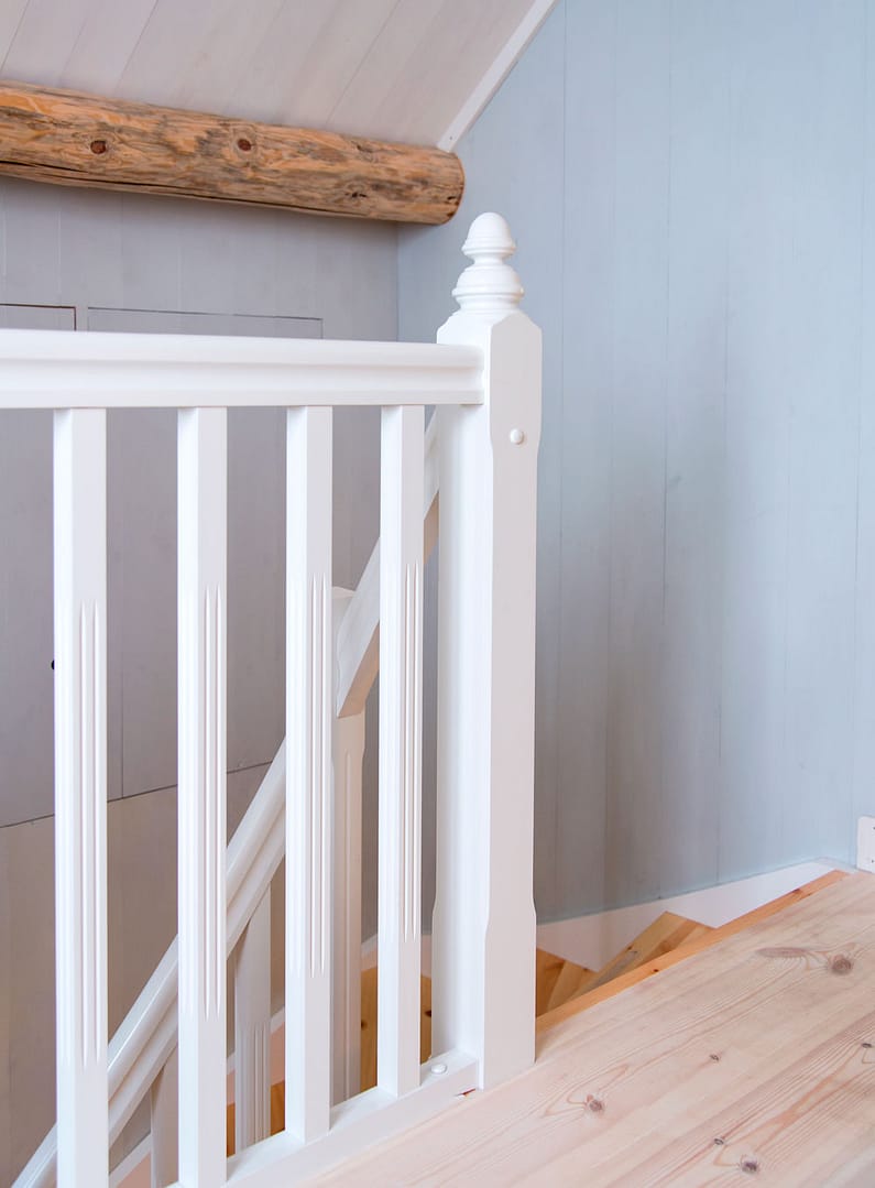 Trappa er laget på Vegårdshei trappeverksted og trappestolpene er kopi av den gamle portstolpen på gården.