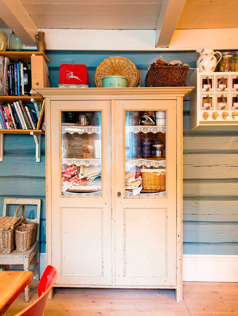 Det koselige skapet kjøpte Kristins far på auksjon en gang. Den gammeldagse krydderhylla til høyre kjøpte Kristin på nett fra Ellas Kitchen company. Den blå fargen på veggene er spesialblandet og tilnærmet lik den originale kjøkkenfargen.
