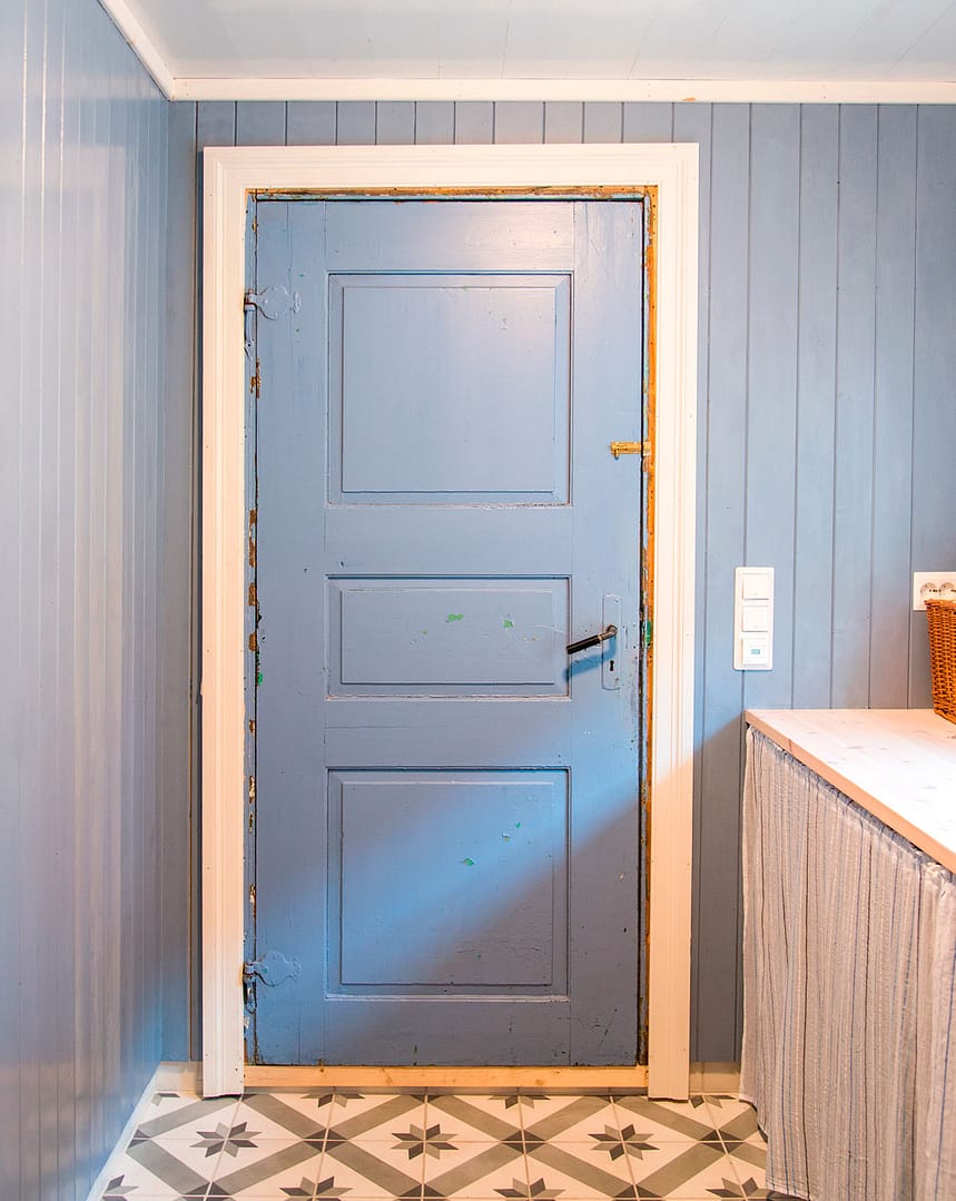 Vaskerommet er malt med linolje i fargen «Jonatans blå, ljus». Fliser fra Ulfven.