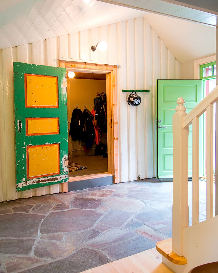 Inne i tilbygget er gangen mellom den gamle og den nye delen markert med skifergulv fra Mjåvatn i Froland. Både panel og dør er originalt til huset. Svanehalslampen er ny og kjøpt på Molo i Oslo.