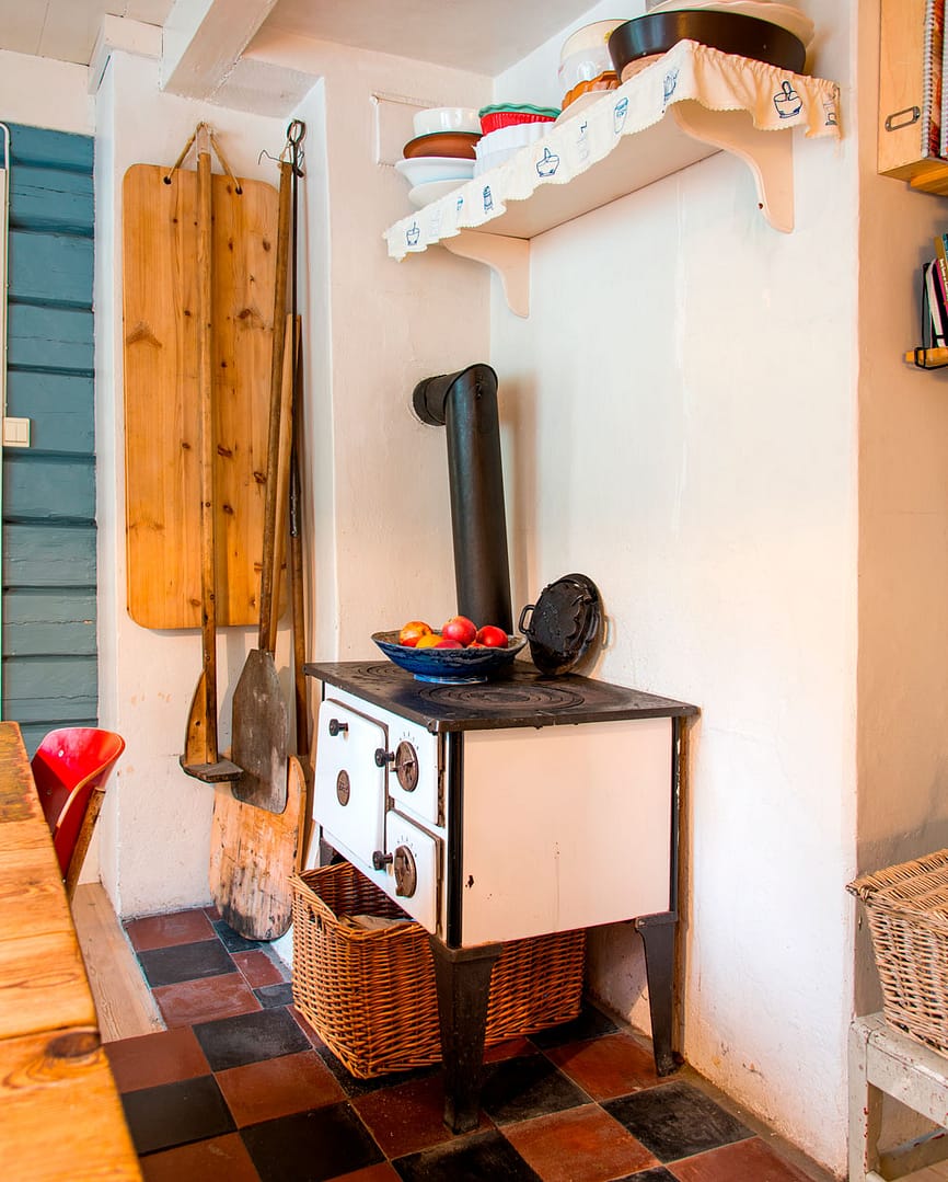 Vedkomfyren med vaffeljern er kjekt å ha når strømmen går. Den er original fra Kristins besteforeldres tid i huset.
