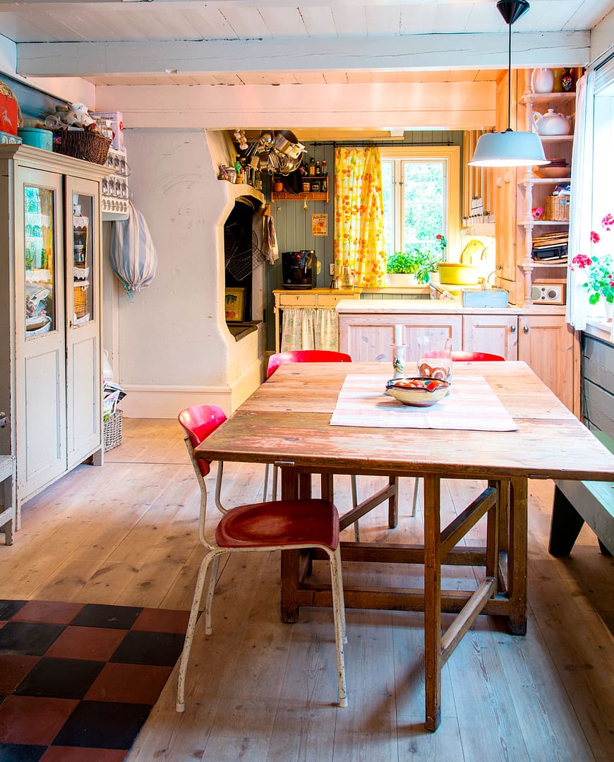 Det koselige kjøkkenet har innredning laget av Lars Storsæter, Gjærbrønden Snekkeri i Grimstad. Den utnytter plassen optimalt og er tilpasset skjevheter i gulv, vegger og tak, samt takbjelkene. Den store bakerovnen brukes flittig og rommer hele 19 brød.