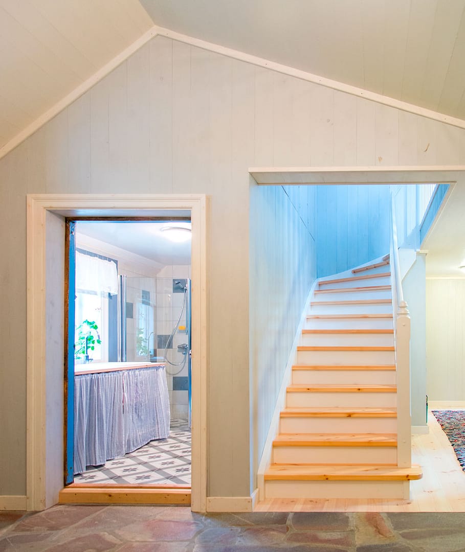 Tilbygget er åpent mot mellomgangen. Vaskerom og bad til venstre, trapp opp til loftsstue og soverom til høyre.
