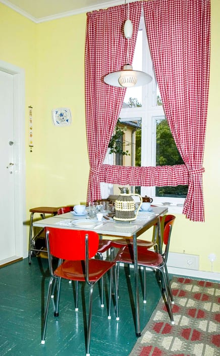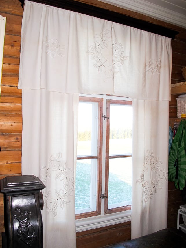 Denne type gardiner, med retthengende sidesjal og en smal, rynket kappe, er i tråd med svenske Ellen Kays ånd, ble populære fra 1930-årene og framover til 1970-tallet. Foto: Kari-Marte Frøyset