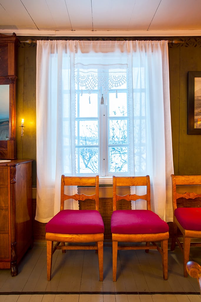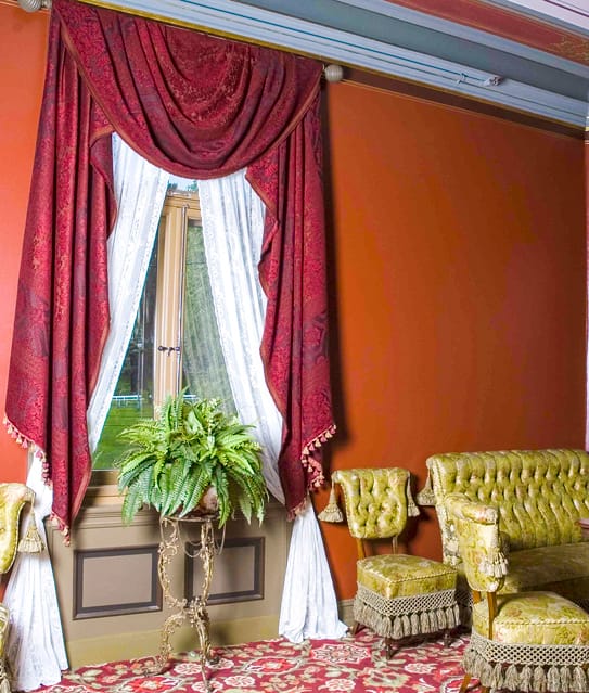 Gardiner fra «Den Røde Salong» i Ibsens leilighet i Arbins gate. Tidstypisk arrangement med hvite sidegardiner i kombinasjon med en kappe av tyngre stoff. Foto: Norsk Folkemuseum.
