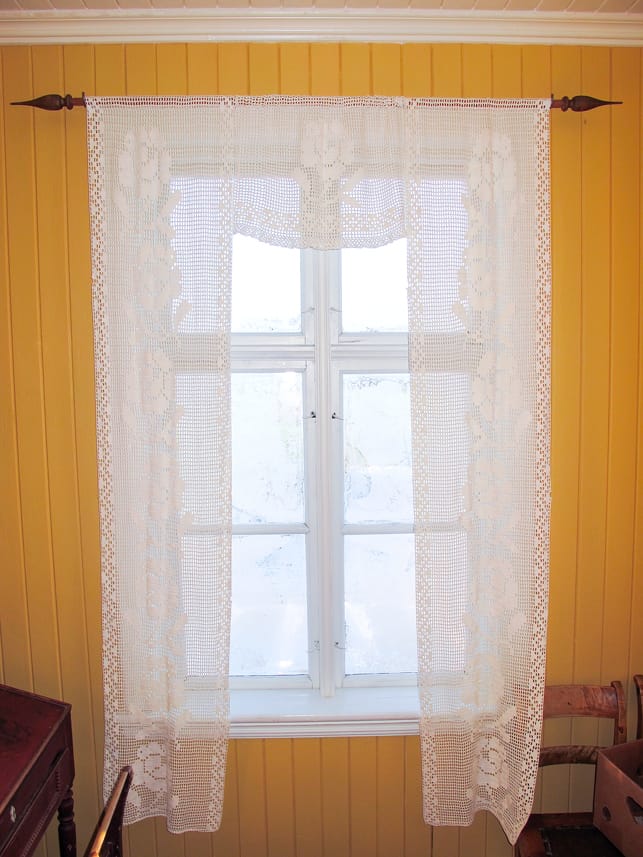 Fra slutten av 1800-tallet og fram til rundt 1940 var gardiner et populært handarbeide. Dette hadde sammenheng med Arts & Crafts-bevegelsens fremmarsj i samme periode. Disse heklede gardinene er fra rundt 1910. Foto: KM Frøyset