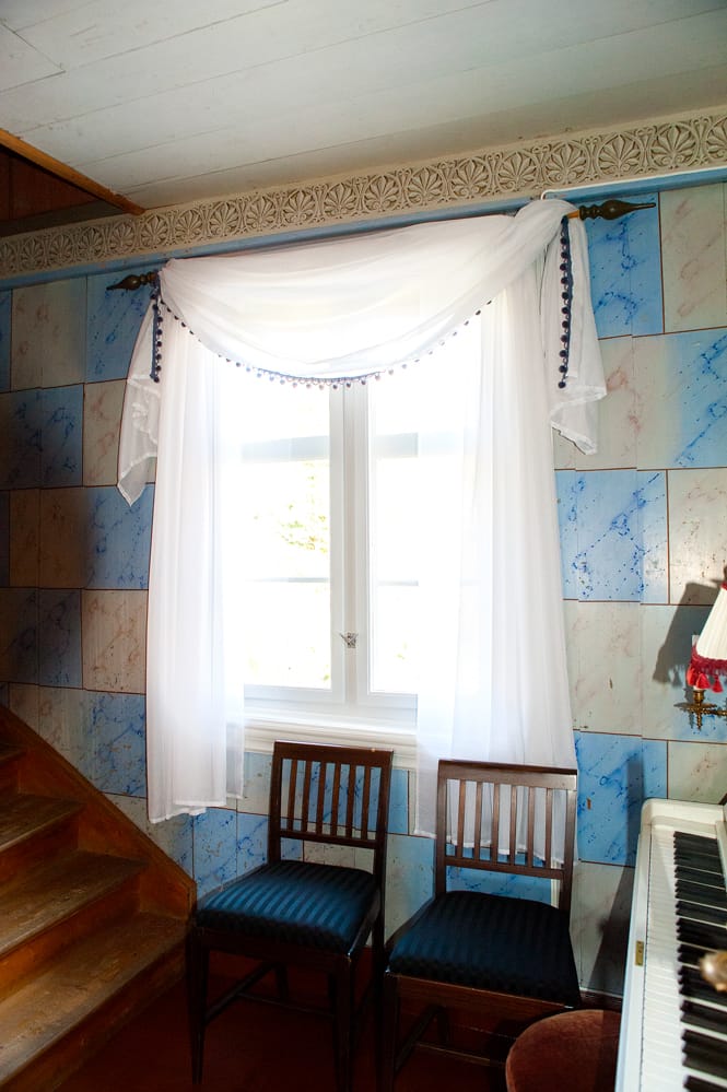 Empireinspirerte gardiner i ballsalen på Yttersø Gård i Larvik. Rullegardinen er gammel, antageligvis fra siste halvdel av 1800-tallet, da sjablonmalte rullegardiner var svært populært. Foto: KM Frøyset