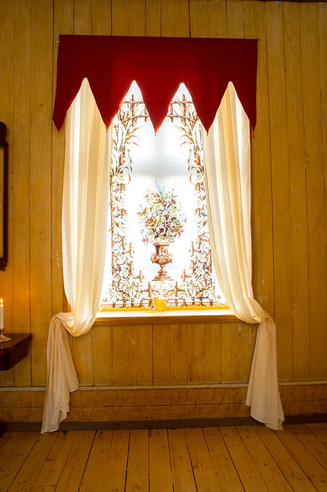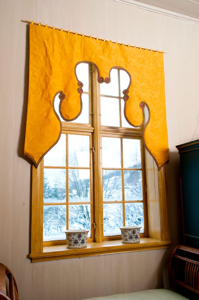 En slik glatt og foret kappe, skåret i buer og tunger, kalles lambrequin. Kappene kom på 1600-tallet og fikk en renessanse under historismen, ca 1850-1900. Lamberquinene ble gjerne kombinert med tynne, hvite sidegardiner. Foto: KM Frøyset