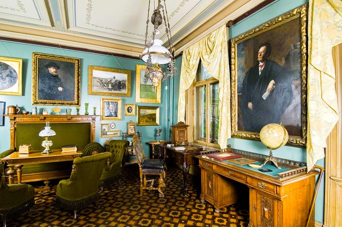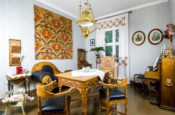 Ibsens arbeidsværelse imed kopi av de eksklu- sive silkegardinene. Foto: Norsk Folkemuseum