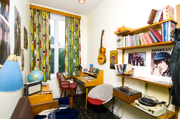 Tenåringsrommet i 1965-leiligheten i Wessels gate 15 har tidstypiske gardiner med geometrisk mønster. Smalt, tidstypisk gardinbrett i palisander. Foto: Norsk Folkemuseum