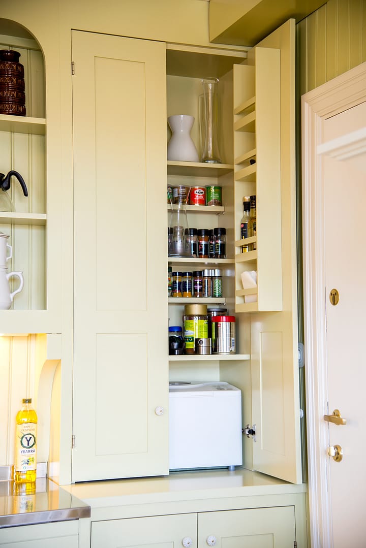 Et smart krydder-skap med hylle i dørene. Nederst er det plass til brødbakemaskinen.
