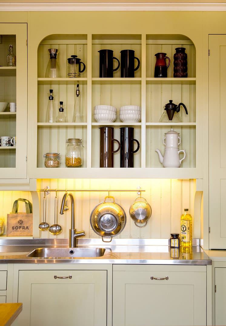 • Vi liker skapene, kombinasjonen av lukkede og åpne løsninger, og at de går helt opp til taket, og at kjøleskapene er bygget inn – dette i kombinasjon med fargen gir en god stemning når vi kommer inn i rommet – det er et godt rom å være i!