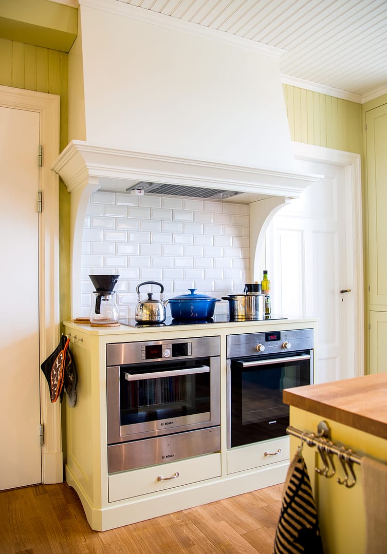 Overskapene går helt til taket og det er godt med skapplass på kjøkkenet. Kokesonen er plassert mellom døra til det gamle pikeværelset og kjøkkeninngangen. En stor induksjonsplate gir rom for kulinariske utfoldelser, helt ypperlig for den som liker å lage mat til mange. Damphetta i gammel stil skjuler en kraftig vifte og en ekstra bred kokeplate på 90 centimeter gir plass til mange kjeler.