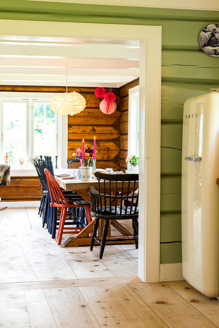-Det måtte bli et SMEG-kjøleskap. Det var det jeg synes passet best inn, forteller Maria. Fra kjøkkenet er det bare noen få skritt til spiseplassen og det massive langbordet Rolf Trygve har laget.