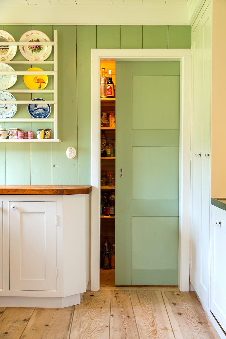 Paret funderte lenge på hvordan de skulle integrere et spiskammer på best mulig måte. Det er på knappe 3 m2 og har spesialbygde hyller til blant annet steketakke. Veggene og dør til spiskammer er malt i fargekoden S2020-G10Y. Grønnfargen på speilene er kun brukket med litt hvitt.