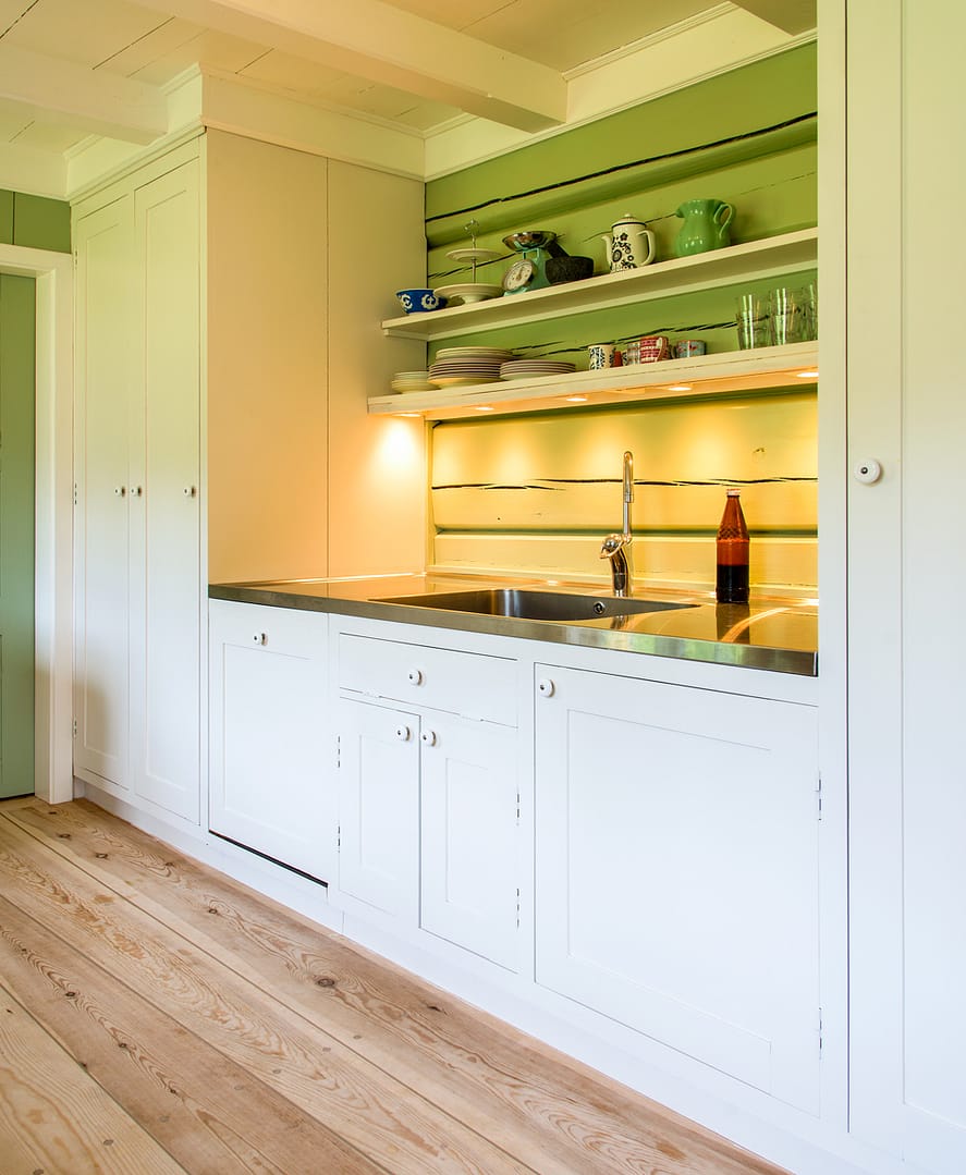 Paret valgte bort overskap og bygget heller fire romslige høyskap, to på hver side av den spesialbestilte oppvaskkummen i stål. I tillegg tegnet de inn et romslig spiskammer.